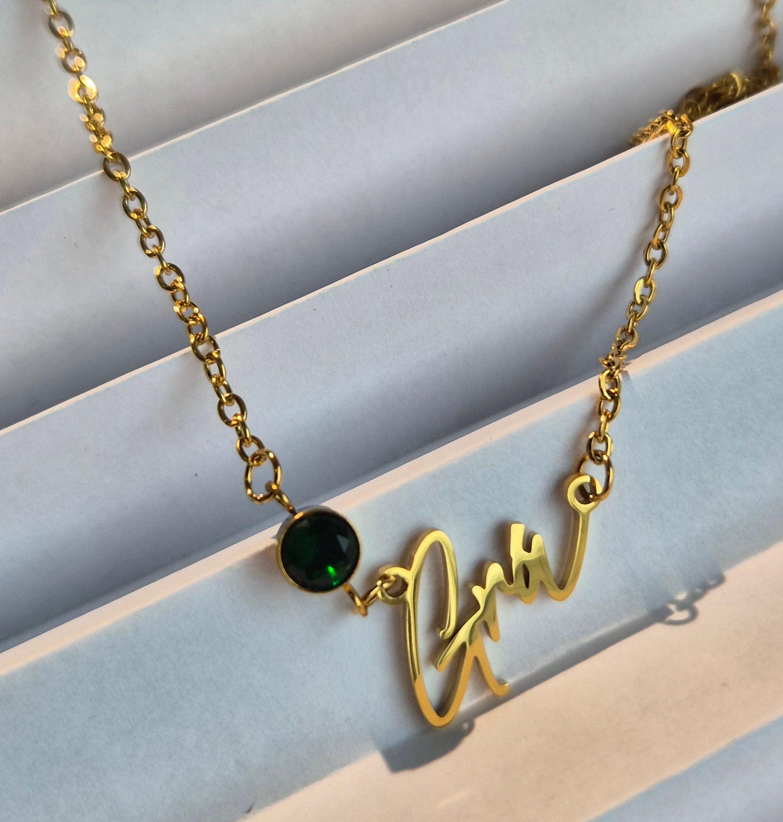 This graceful necklace features a unique stainless steel base, available in plated silver or 18k gold. A vivid green zircon stone delicately connects the chain to the handwritten Grá pendant, symbolising love rooted in growth, harmony, and renewal.