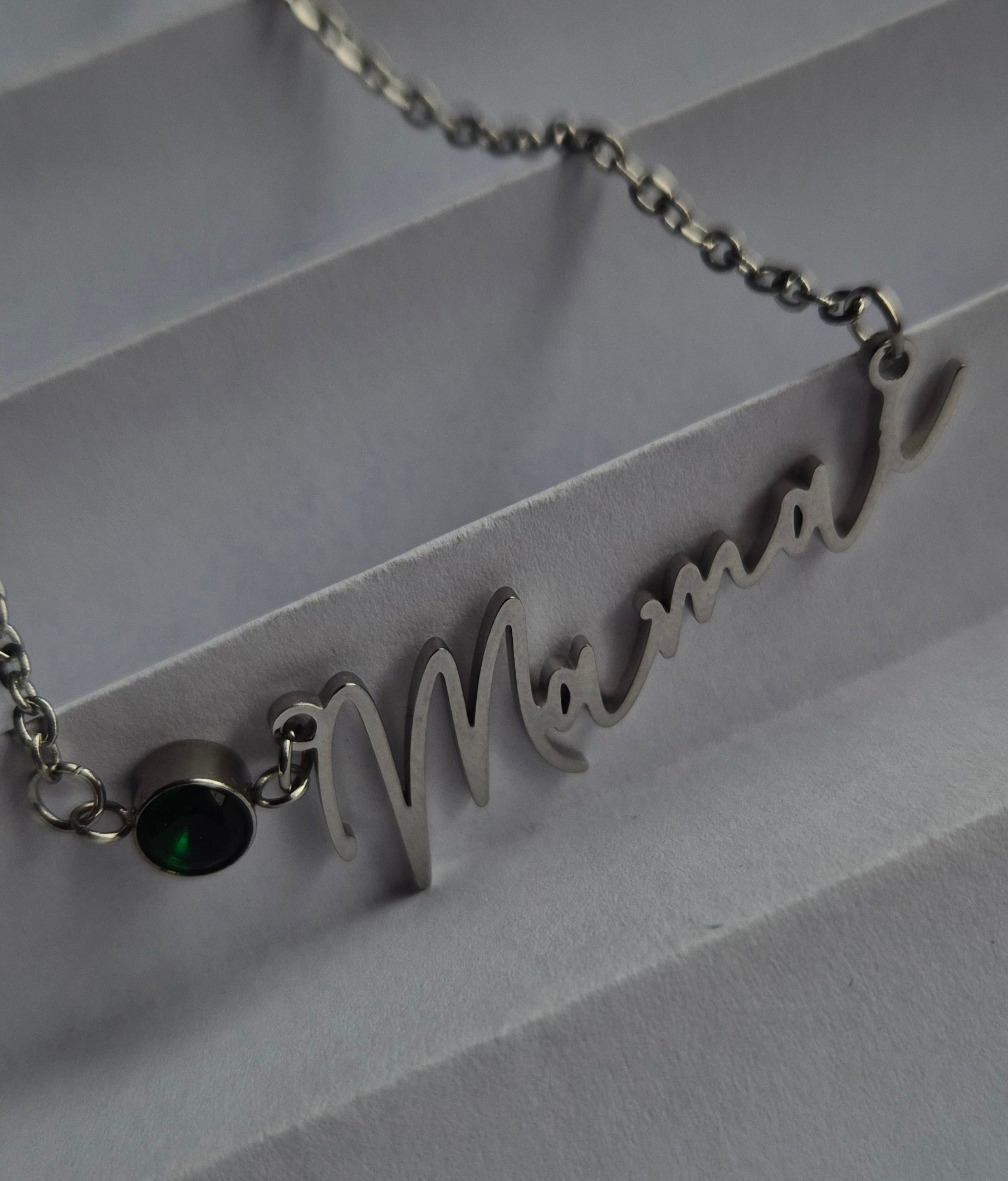 This graceful necklace features a unique stainless steel base, available in plated silver or 18k gold. A vivid green zircon stone delicately connects the chain to the handwritten Mamaí pendant.