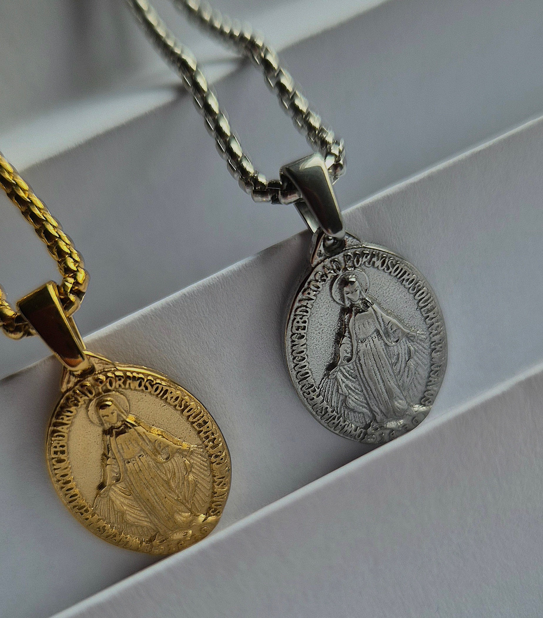 This double-sided Miraculous Medal pendant is beautifully crafted in polished stainless steel and available in radiant gold or sleek silver tones. One side features the Blessed Virgin Mary surrounded by the prayer “O Mary conceived without sin, pray for us who have recourse to thee,” while the reverse bears the traditional Miraculous Medal symbols — the cross, the “M,” and the Sacred Hearts — representing unity, love, and faith.