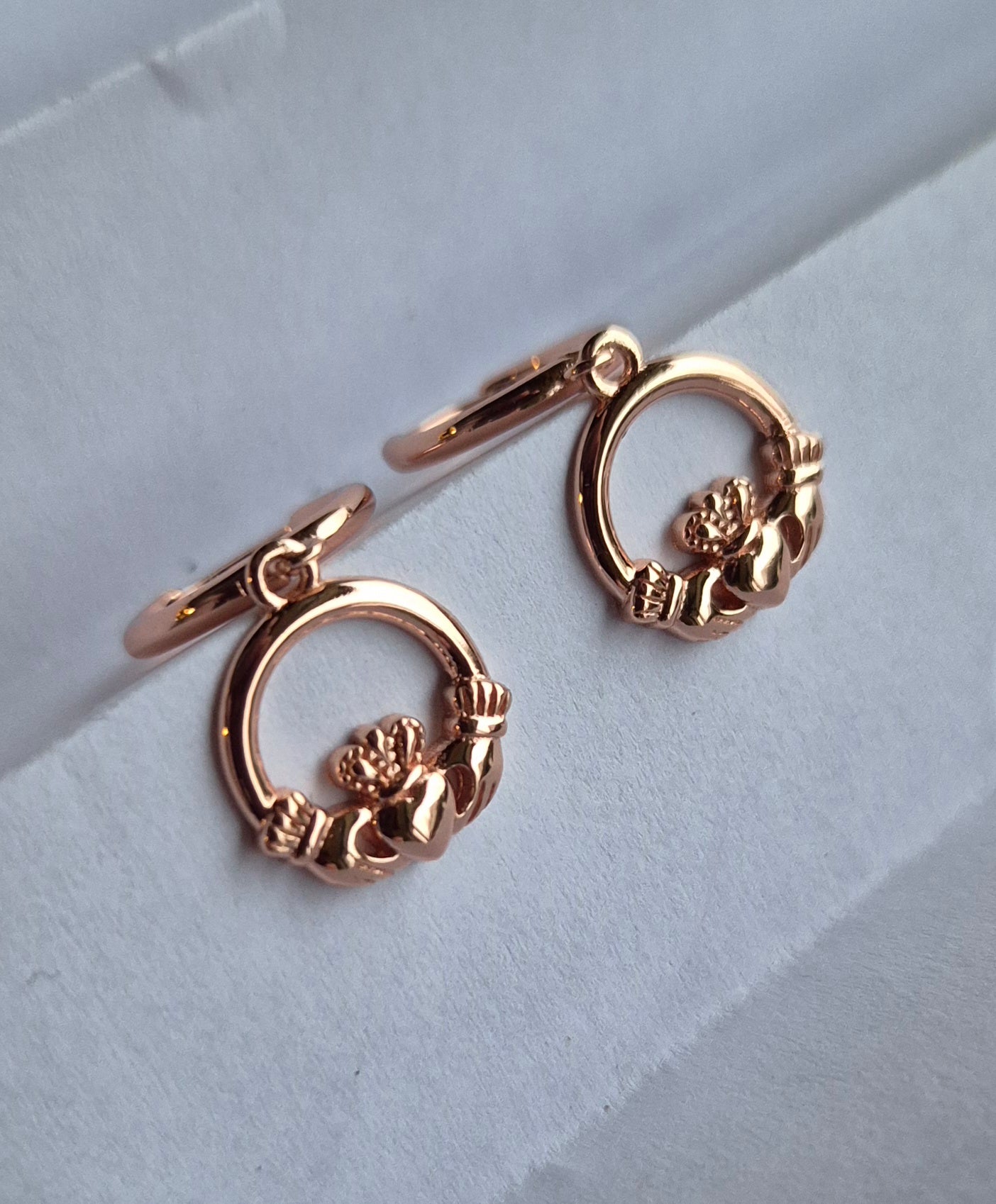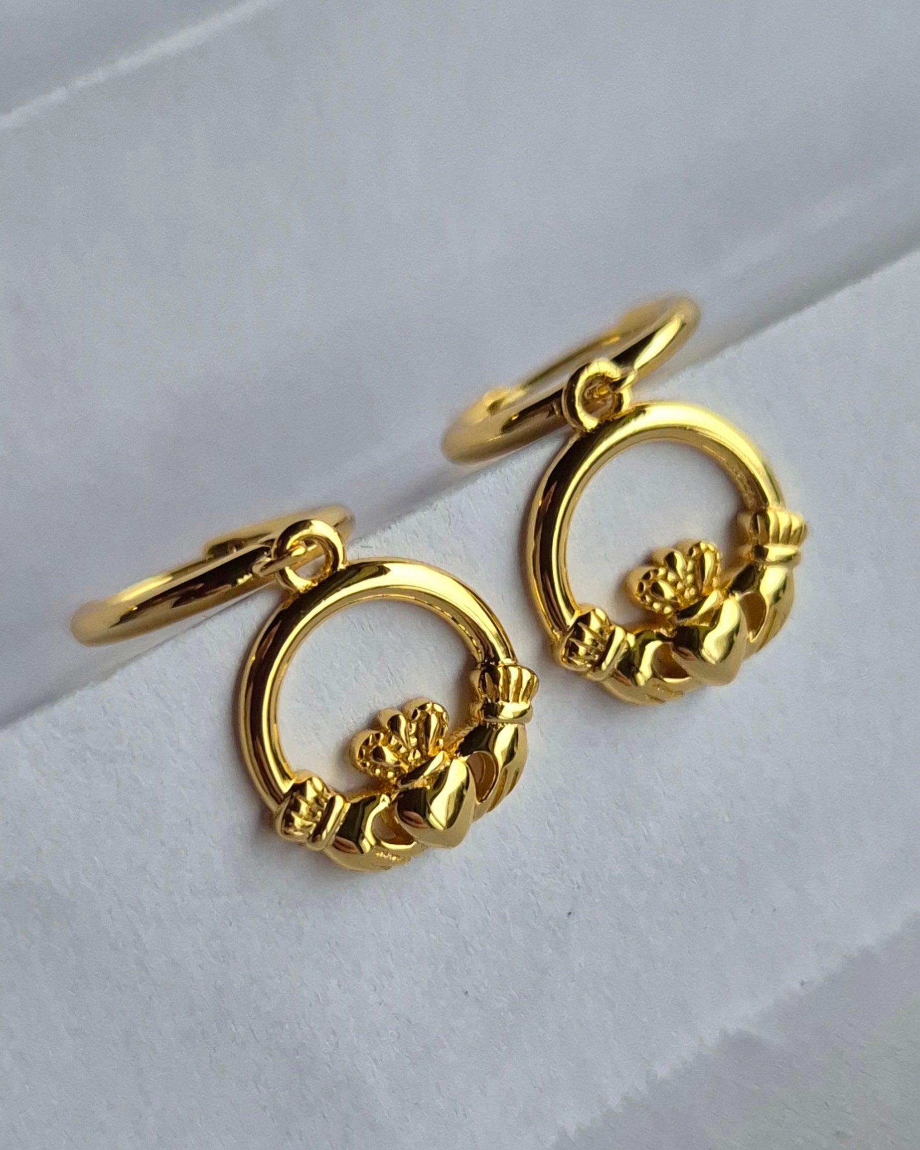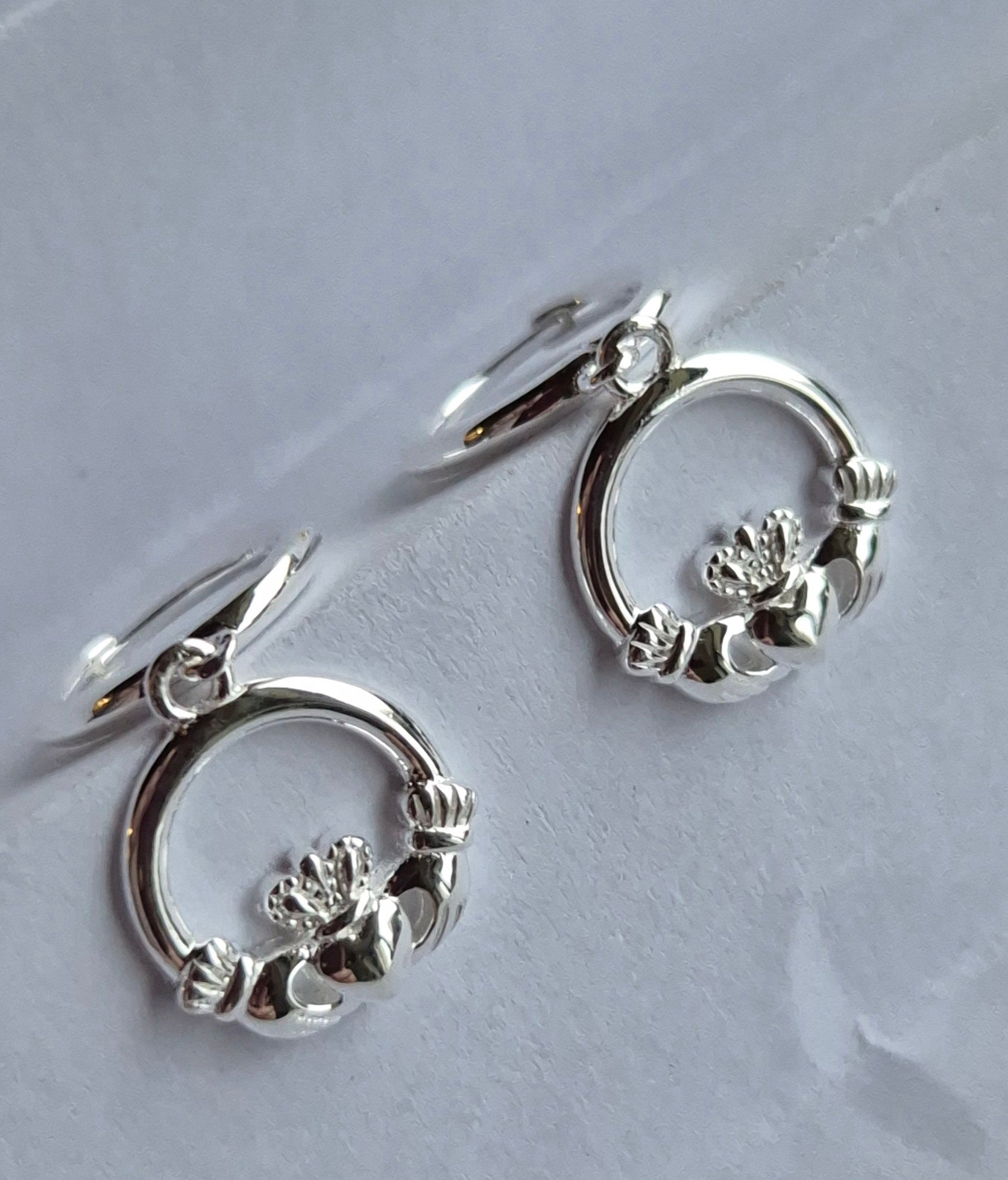 These Claddagh huggie drop earrings are crafted in sterling silver, forming a gentle circle that rests close to the ear, symbolising protection, connection, and belonging.
