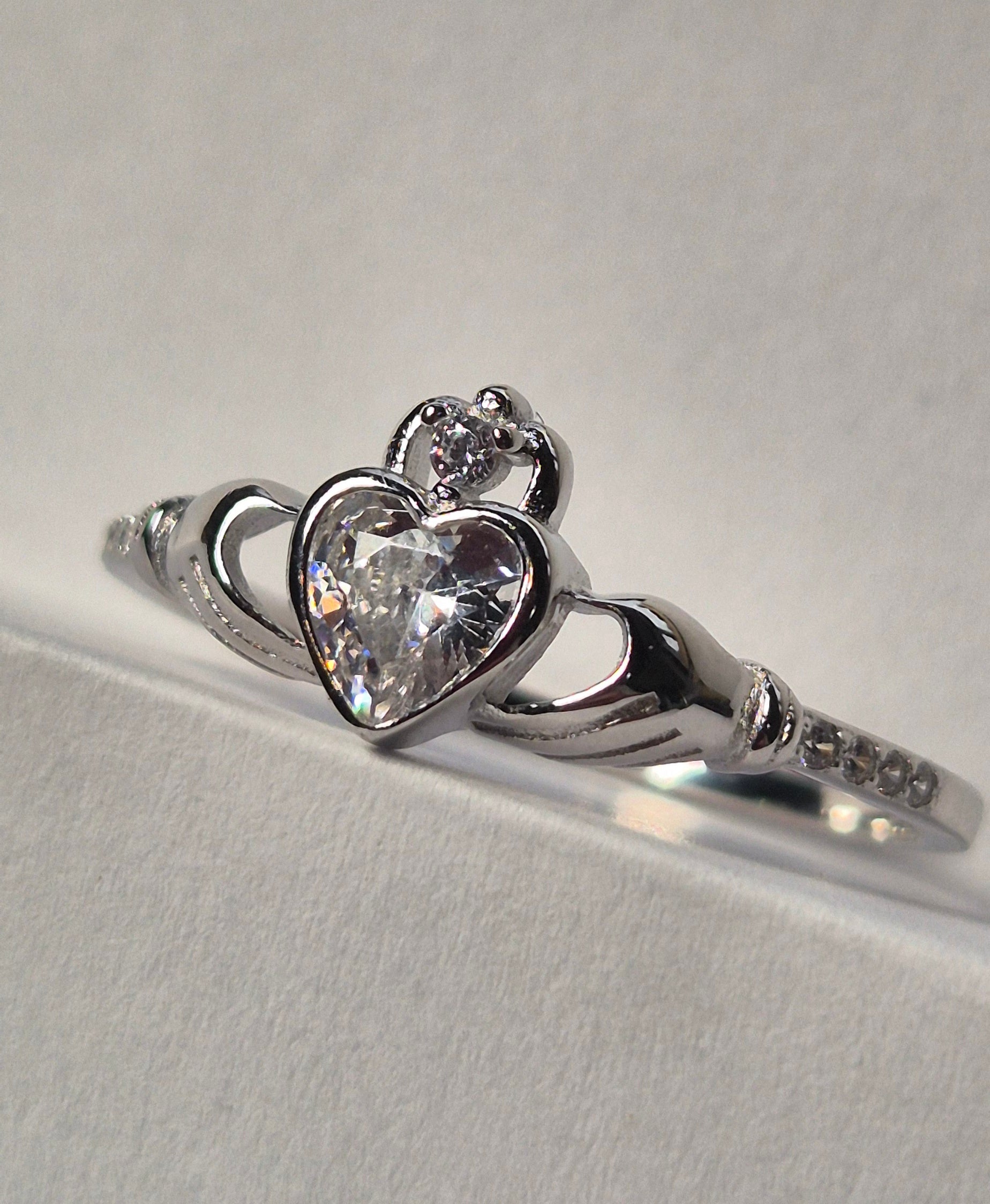 Crafted in sterling silver, this ring features a white zircon heart, pure and luminous, embraced by hands of devotion.